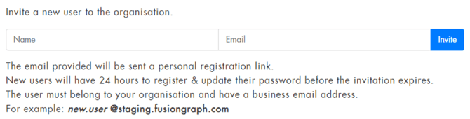 The [Organsiation] Setup area also lets you invite people to set up an account by entering their name and email address. This will send them an email containing full instructions about how to login and set their password.