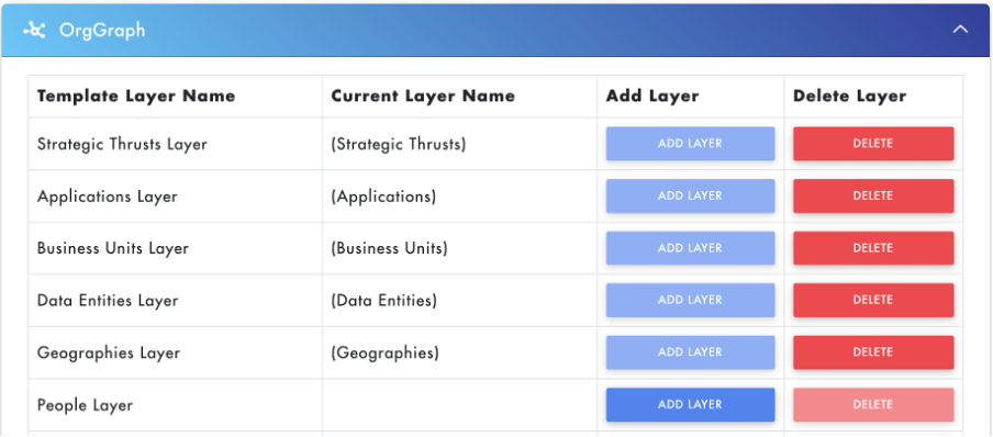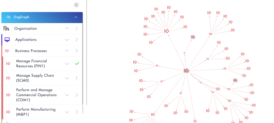 In the example below the Strategic Thrusts, Applications, Business Units, Data Entities and Geographies layers have all been added to the OrgGraph.