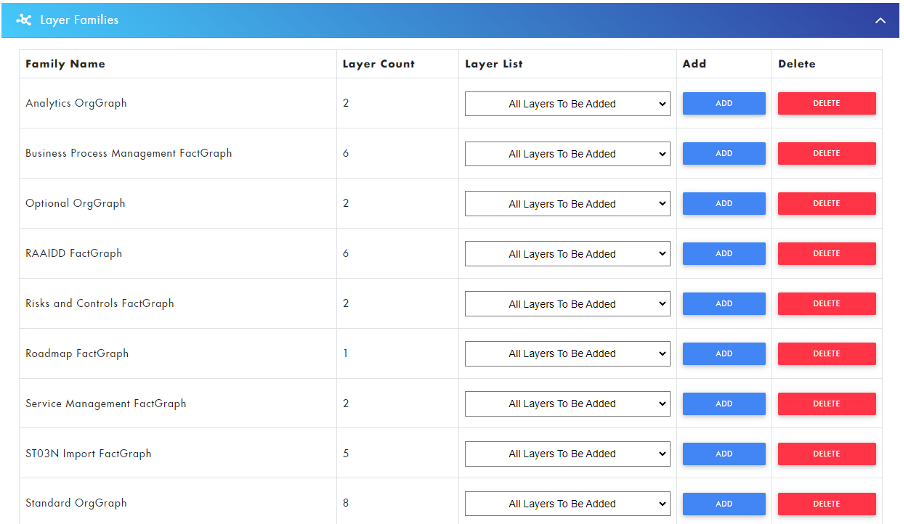 Alternatively the Families and Groups option can be used to add preselected groupings of layers. For example, use the Business Process Management FactGraph family to add all 6 layers in that group in one step.