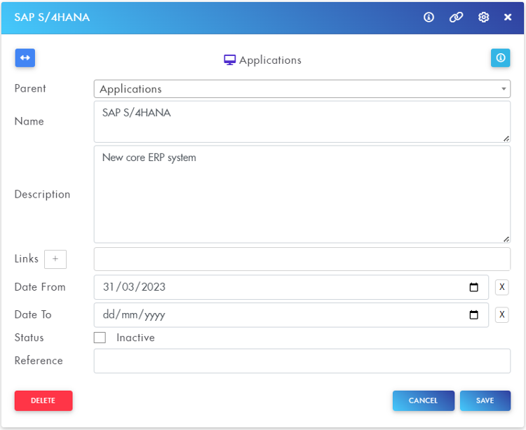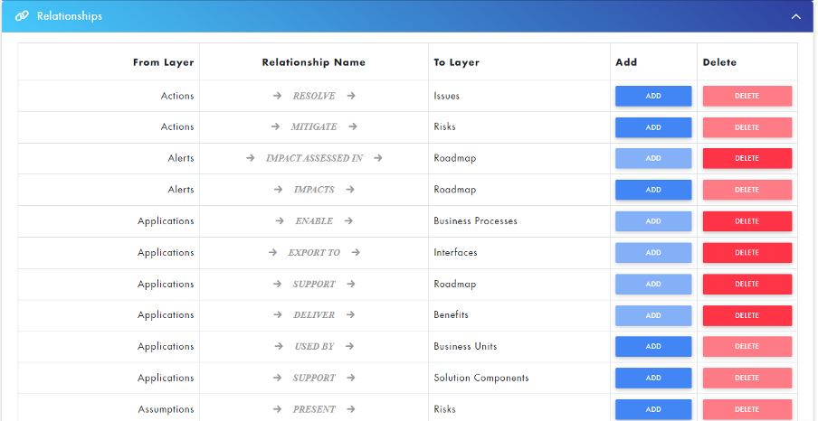 Optionally used to create connections between items. It’s possible to create connections between data items as part of the upload process or these can be uploaded or manually done later. To connect data layer items, a column is required for the relevant layer relationship name and needs to contain the exact name(s) of the connection data items all comma separated. Initially this is more important for certain data layers: ● Interfaces: To indicate which applications the interfaces connect from and to ● Business processes: To indicate which applications they run on and in which geographies ● Data entities: To indicate which applications, interfaces, business processes they connect to |