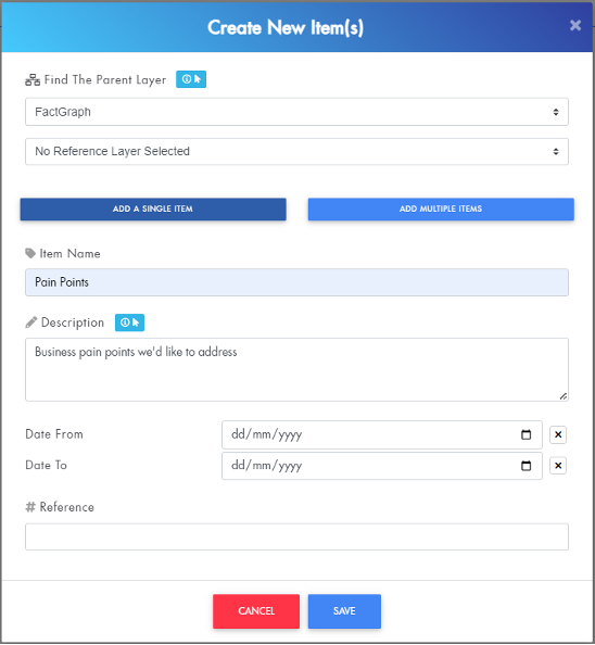 Choose the top level layer and enter the required details to create a new custom data layer in the required section. Here we see a new Pain Points later being added to the FactGraph.