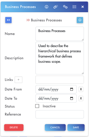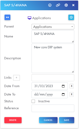 Optional in format YYYY-MM-DD Required for time based items like projects and phases. Also useful to show the lifespan of items especially where they are due to be decommissioned or replaced. |