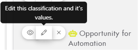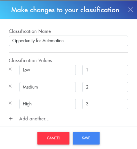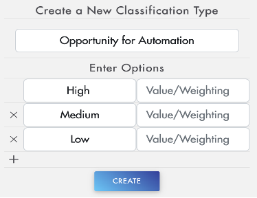 In the example below a new classification has been entered for Opportunity for Automation with the available options including High, Medium and Low.