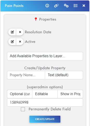The properties panel in FusionGraph allows you to add custom field details to your layer items. Custom properties can be added to any layer to store additional texts, dates, numbers, checkboxes, etc.