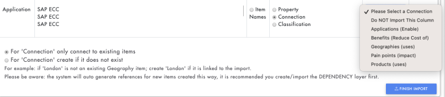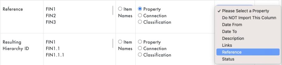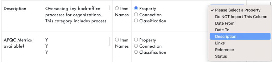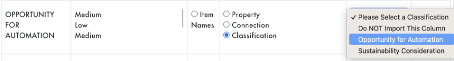 PLEASE NOTE: If you accidentally click Property/Connection/Classification for a column you do not want to import. You can select 'Do NOT Import This Column' from the dropdown to deselect it.