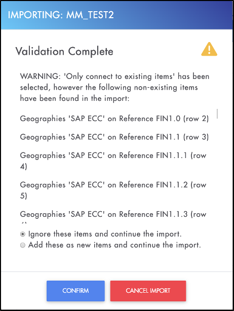 Note: If FusionGraph finds new data within that column in the CSV that doesn't already exist, it will give you a warning and a summary of the items identified. The items identified in error may be an indication of a typo in the name. This allows users the ability to abandon the import process and correct any mistakes (if there are any) and re-attempt the import.