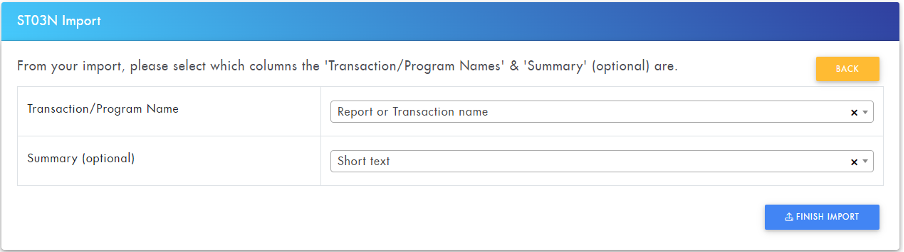 Once the import file has been selected, a second window will appear. Here you can select which column from your CSV contains the 'Transaction/Program Name' and optionally, which column contains the Summary/Short text. This will add a description to each imported item. Once your columns have been selected, press Finish Import.