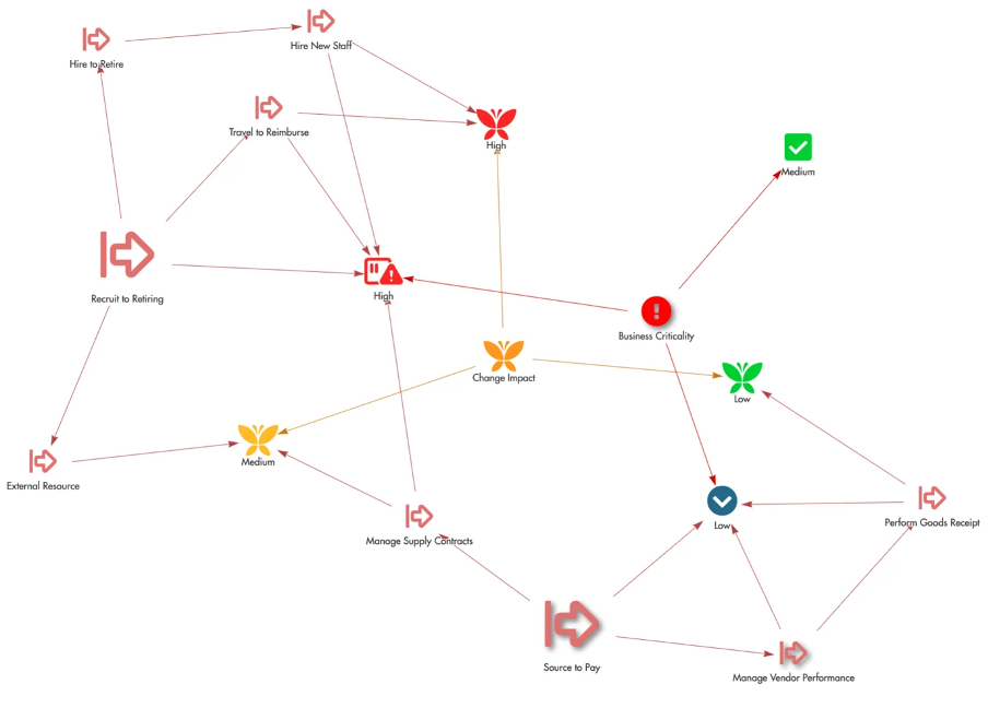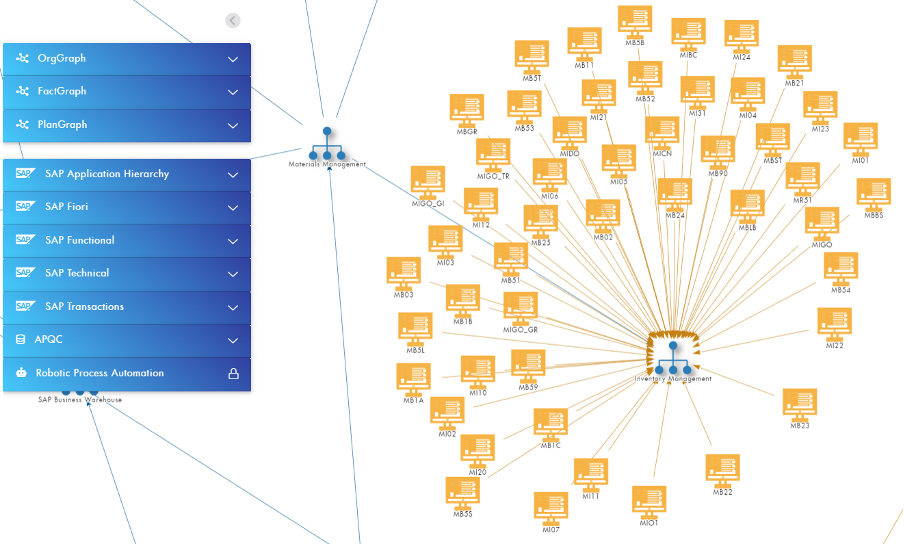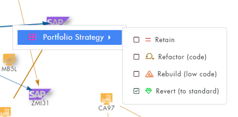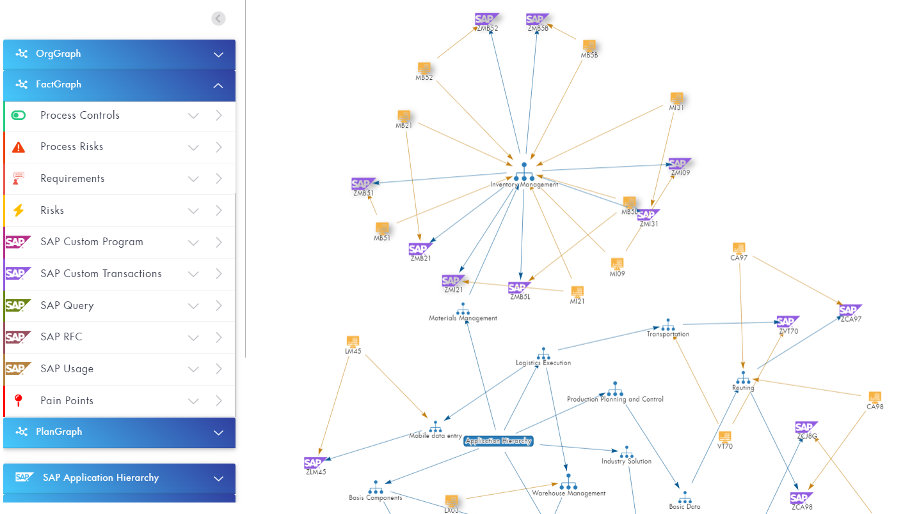 For example, you can add the SAP Custom Transactions to the Canvas and then impact assess them against the SAP Transactions and the SAP Application Hierarchy to see where they are connected to.