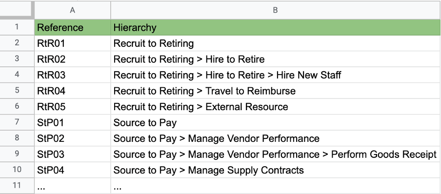 Your spreadsheet must contain a Reference column (called 'Reference'), containing a unique ID for each Business Process, and a hierarchy column containing the names of each Business Process.