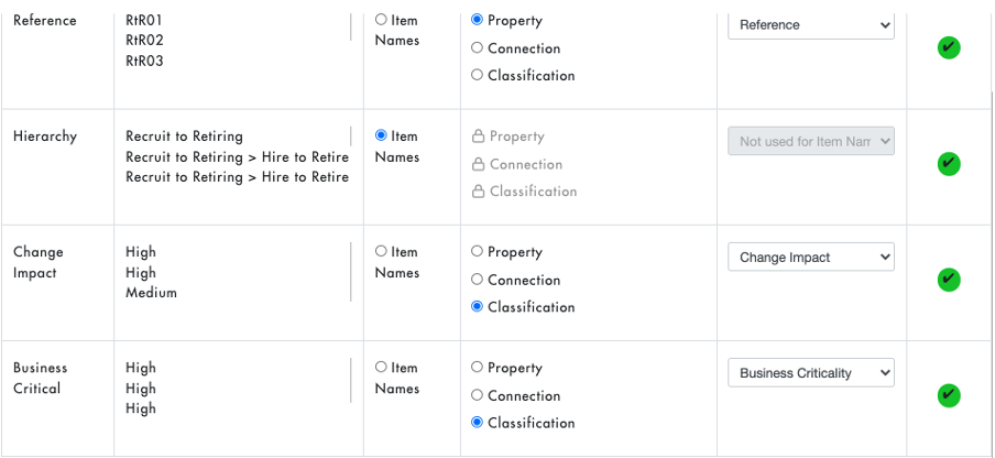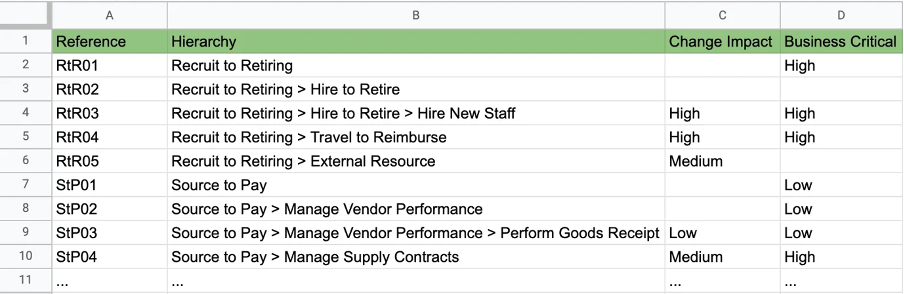 NOTE. The Classifications will only be applied to the items where a value is present in the input data. For example, External Resource (row 6) will be given a Change Impact value of Medium but its parent, Recruit to Retiring will not. If you would like higher level items to be given a value you need to specify the value on the appropriate row as well.